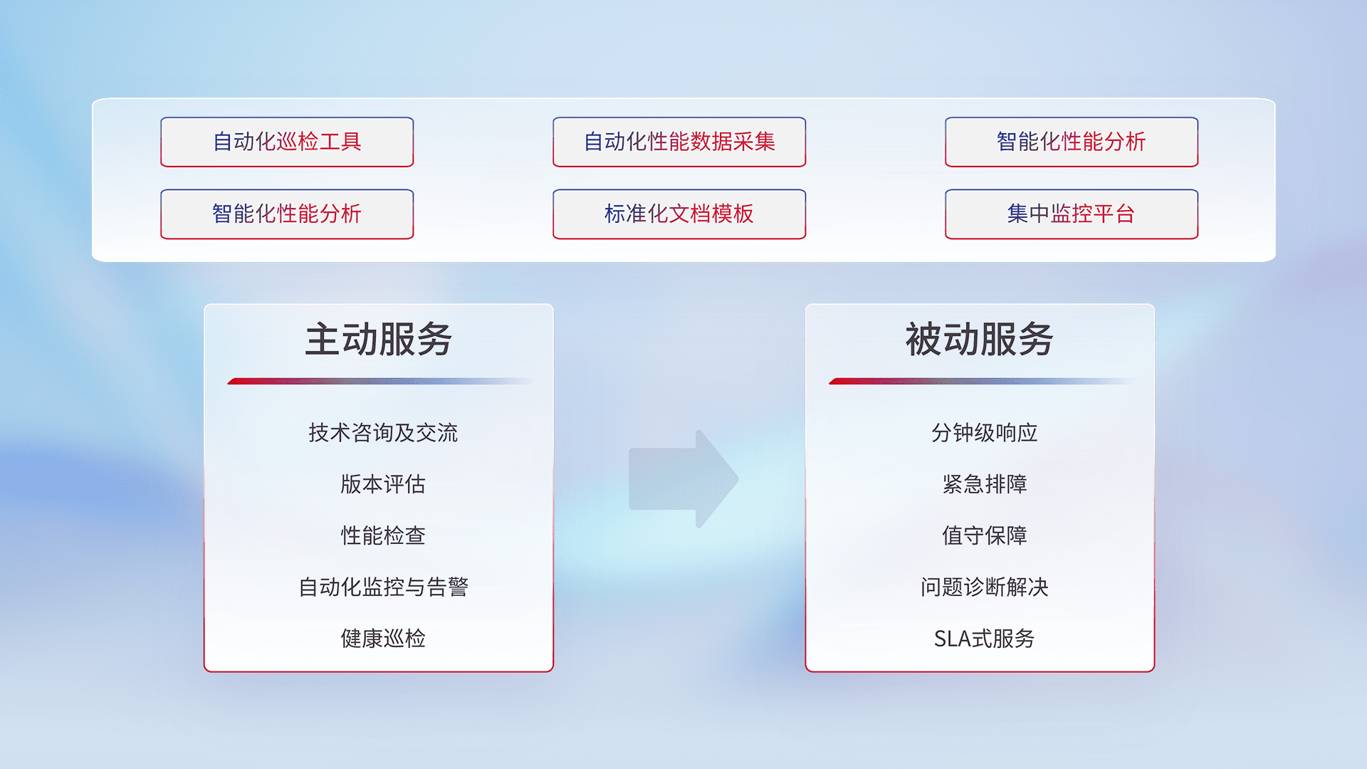 智能化工具和标准化文档,,,保障服务质量,,,提供主动服务(包含技术咨询、、版本评估、、性能检查、、自动化监控与告警、、、健康巡检)和被动服务包含(分钟级响应、、紧急排障、、值守保障、、、问题诊断解决、、SLA服务)。。